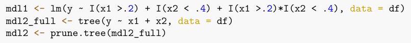 mdl1 $<-\operatorname{lm}(\mathrm{y} \sim \mathrm{I}(\mathrm{x} 1>.2)+\mathrm{I}(\mathrm{x} 2<.4)+\mathrm{I}(\mathrm{x} 1>.2) * \mathrm{I}(\mathrm{x} 2<.4)$, data $=\mathrm{df})$